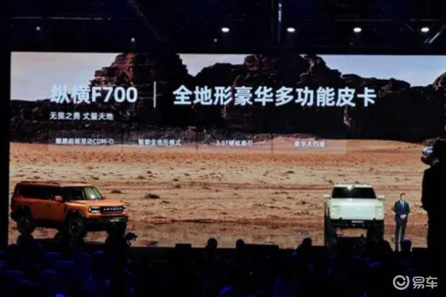紧接着第三款车,就是纵横F700,这款车作为皮卡,也是采用了鲲鹏超能混动CDM-O,具备智能全地形模式,不过是一台四座车型,所以这一点需要注意,当然这台纵横F700也具备牵引能力,牵引质量达到了3.5吨。
