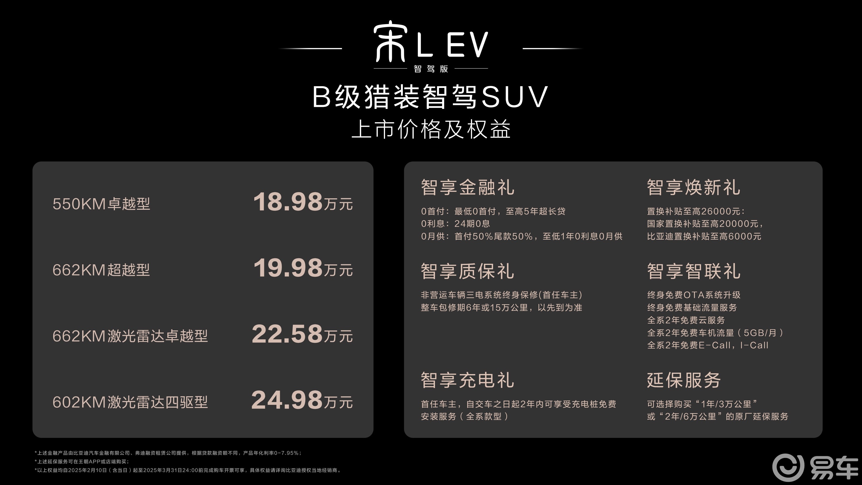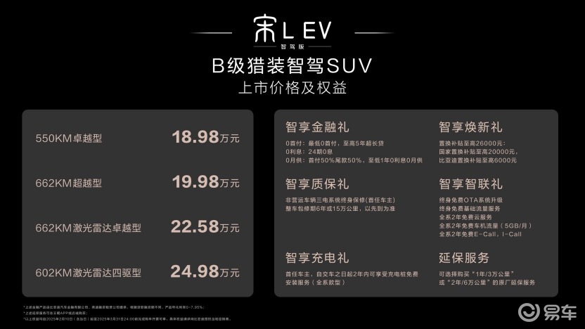 伴随宋L EV智驾版的上市,比亚迪王朝还准备了“全民智驾 智享礼遇”,进一步降低消费者的购车用车成本,让高品质的美好出行触手可及。自上市之日至2025年3月31日24:00前完成购车开票,购买宋L EV智驾版可享“置换补贴至高26000元”等多重礼遇,具体权益请详询比亚迪授权当地经销商。