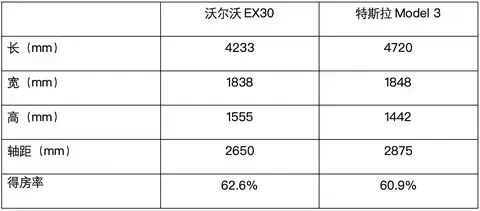 在车内空间上,定位在中级轿车的Model 3自然会超过一款小型suv EX30一截。但值得一提的是,EX30在“得房率”上超过了Model 3,这就意味着沃尔沃EX30的底盘布置效率更高。