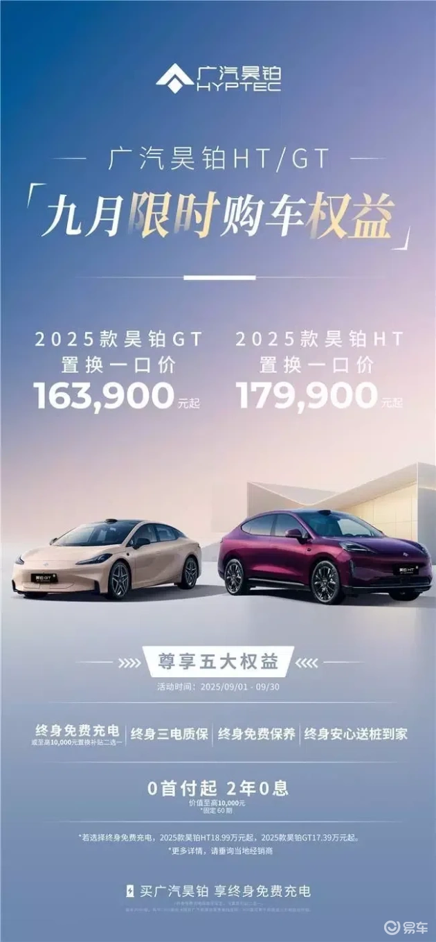 在权益方面,昊铂HT表现出极大的诚意。终身免费充电(限额度)、终身三电质保、免费保养以及赠送充电桩等服务,都是直接降低长期用车成本的实际福利。此外,9月限时购车还可享受5999元补贴,整体品价比显著提升。相比之下,小鹏G7虽然也有相应的权益,但更多侧重于限时金融政策或选装优惠,从长期拥车角度来看,昊铂HT的“管家式服务”无疑能为用户带来更多的便利和实惠。