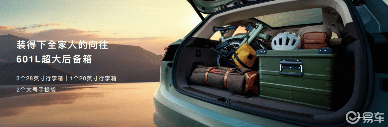 储物能力更是堪称"空间魔术师",601L的后备箱容积可同时容纳3个28寸行李箱+1个20寸登机箱,放倒二排座椅后更能扩展至1837L,轻松装载1.6米滑雪板或儿童自行车。纯电版车型独有的124L电吸电弹前备箱,配合后备箱盖板下80L储物暗格及车内31处储物空间,让琐碎物品各得其所。车顶标配75kg承重的行李架,还可进一步拓展生活场景可能。