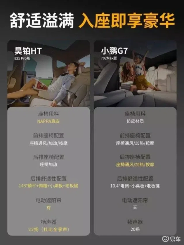 配置上的“暗坑”更让人防不胜防。昊铂HT 825 Pro将Nappa真皮座椅、前排通风加热、电动调节等豪华配置列为全系标配,用户无需额外选装即可享受完整体验。而小鹏G7的类似配置需要通过选装包实现,或者作为权益“赠送”,将本应在这一价格区间内标配的配置变为“增值服务”,增加了用户的购车成本和决策难度。