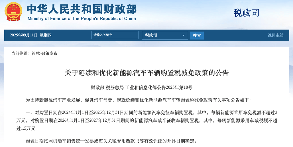 2023年6月,财政部、税务总局、工信部等三部门发布的《关于延续和优化新能源汽车车辆购置税减免政策的公告》(以下简称《公告》)中明确,对购置日期在2024年1月1日至2025年12月31日期间的新能源汽车免征车辆购置税。其中,每辆新能源乘用车免税额不超过3万元;对购置日期在2026年1月1日至2027年12月31日期间的新能源汽车减半征收车辆购置税。其中,每辆新能源乘用车减税额不超过1.5万元。