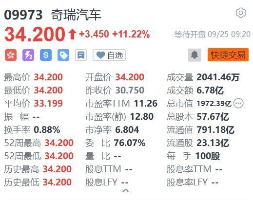 格隆汇9月25日|奇瑞汽车(9973.HK)今日正式登陆港交所,首日上市高开11.22%,报34.2港元。本次成功赴港上市,标志着这家中国汽车巨头在国际化道路上迈出关键一步,开启全新篇章。
