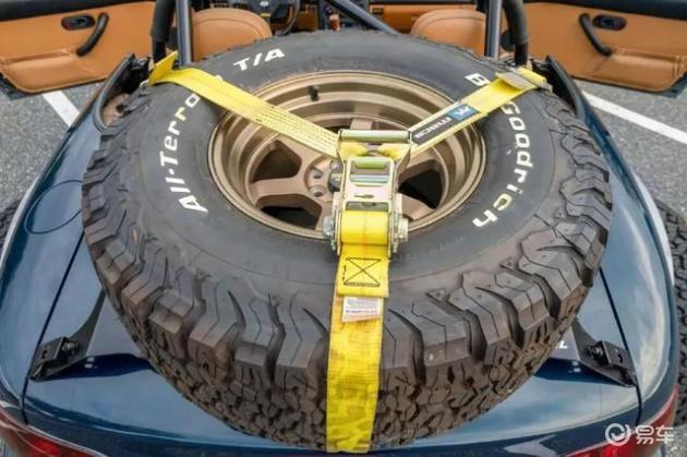 车内增加了Track Dog Racing的Hard Dog防滚架,不仅起到强化车身的作用,当越野侧翻时更能保护车内乘员,这对于敞篷越野车来说非常有必要。而为了拓展装载能力,在后备箱上增加了金属支架,放置全尺寸备胎。