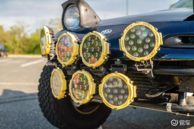 车体方面,切割了前包围,以增加接近角,增加Zerek Fabrication定制防撞杠与下护板,还在护杠上增加了7个LED探照灯,这些都是越野改装常见的装备。而标志性的跳灯还保留着,这种搭配真的很新鲜很吸睛。