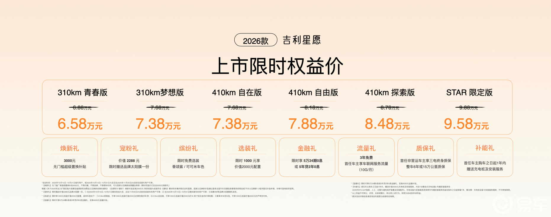 2025年是“智能吉利2025战略”的收官之年,从“造老百姓买得起的好车”到“造每个人的智能精品车”,都是吉利的初心所在。截止今年9月,吉利银河已经收获了145万用户,成为中国新能源最快突破百万销量的品牌,也将在本月成为最快达成年销百万的新能源品牌。随着2026款吉利星愿的上市,将助力星愿在累计销量突破40万辆、稳居全品类车型销量冠军的高基数上,进一步强化"现象级爆款"的市场号召力,驱动银河品牌从市场的引领者,迈向未来出行生活方式的定义者。