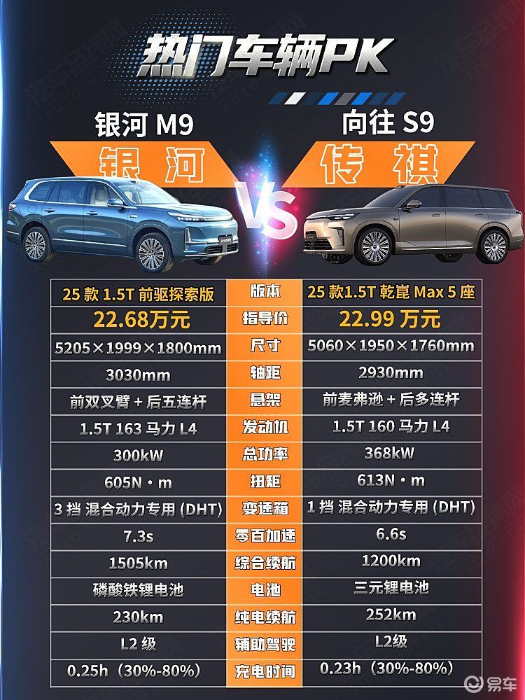 这两款车价格相近,均为插混中大型suv,但却采用了不同的技术路线。银河M9以大空间和AI智能为主打,向往s9则凭借华为乾崑智驾和全系四驱吸引消费者。它们的同时出现,为消费者提供了更加多元化的选择,那么哪一款车更值得入手呢?