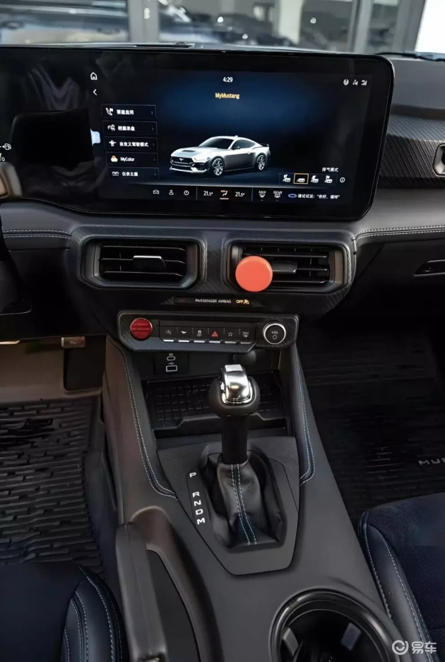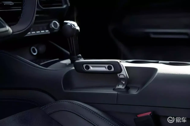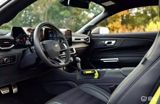 福特Mustang RTR的内饰也进行了针对性的升级。采用黑灰色Alcantara面料铺陈,大面积碳丝编织的黑色碳纤维装饰面板,搭配麂皮材质和灰色Ebony皮革的性能Recaro座椅,辅以荧光绿色的精致缝线设计,贯穿座椅、仪表盘及门板区域。安全带也采用特殊的荧光绿色,加上随处可见的RTR品牌图案与发光门槛饰,强化了整车的专属感。中控台配备了植绒面料的赛车方向盘,银色的换挡拨片,操控岛区域保留了机械式的换挡拨杆和机械手刹,保留了原始的机械质感,提升了操控乐趣。悬浮式的液晶仪表和中控屏融为一体,形成弧面的“带鱼屏”,车辆启动时显示屏将浮现“RTR”荧光绿定制图形,并显示醒目的“RPNDM”挡位标识。