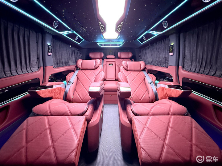 进入到后面的商务舱,首先就是座椅,航空座椅和沙发床是现在商务车的标准配置,航空座椅带有通风加热按摩旋转腿托的各项功能,沙发床可以180度的放平。再者很大的一个板块就是的顶部,顶部的款式是比较多样化的,这一台车子的顶部,用的是内增高的一体成型的顶灯,它是能够实实在在增加车里面的头部空间的,既有颜值性又有实用性。再一个来看车里面的地板,整体平铺,高级的编织纹地板。那么侧墙方面也是整体的软包。从娱乐系统方面来看,顶部是有一个吸顶电视机的,车里面正常的听音乐看电影都可以满足。像其他的细节方面,驾驶室的靠背小桌板休息,脚踏氛围灯光,这些全部都有。