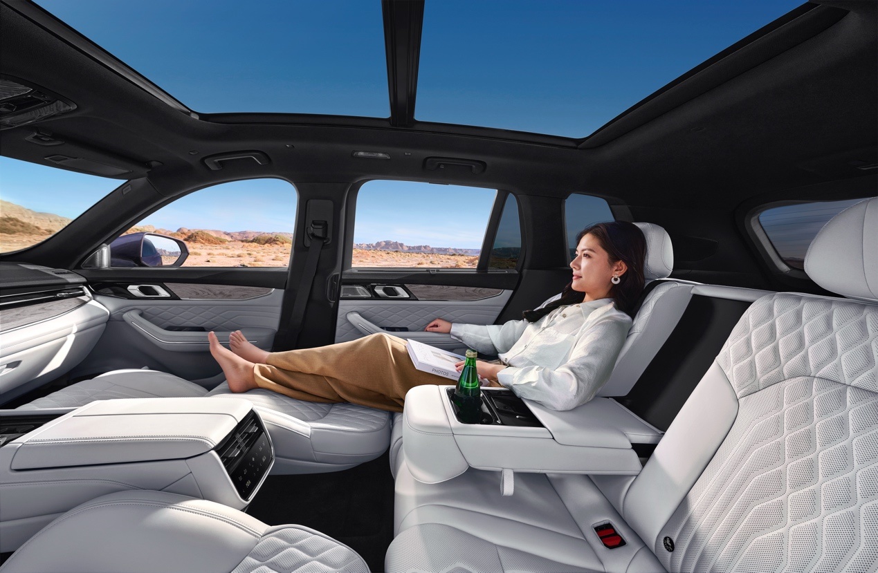 2026款领克09空间的灵活百变性同样出众。前排靠背放倒与二排组成“双人沙发床”,松弛感拉满,无论工作日午休,还是户外躺卧刷剧都格外惬意。二排座椅立起时,后备箱容积达691L,轻松容纳全家出行装备;放倒后,后备箱可扩容至1522L,铺上床垫就是同级最大的“两米豪华大床房”,搭配全景天窗,自驾出游于山野间尽享自由与浪漫。