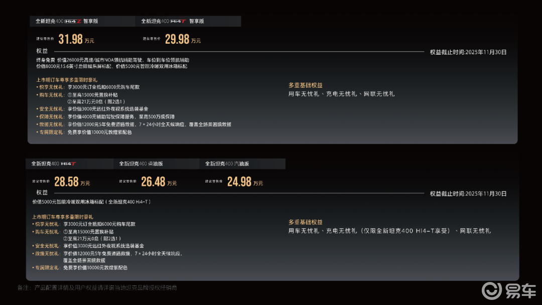 全新坦克400 Hi4-Z智享版,售价31.98万元;全新坦克400 Hi4-T智享版,售价29.98万元;全新坦克400 Hi4-T,售价28.58万元;全新坦克400 柴油版,售价26.48万元;全新坦克400 汽油版,售价24.98万元。即刻下单可享多重尊崇权益,坦克以满满诚意为年轻用户体验潮酷越野带来惊喜购车优惠。