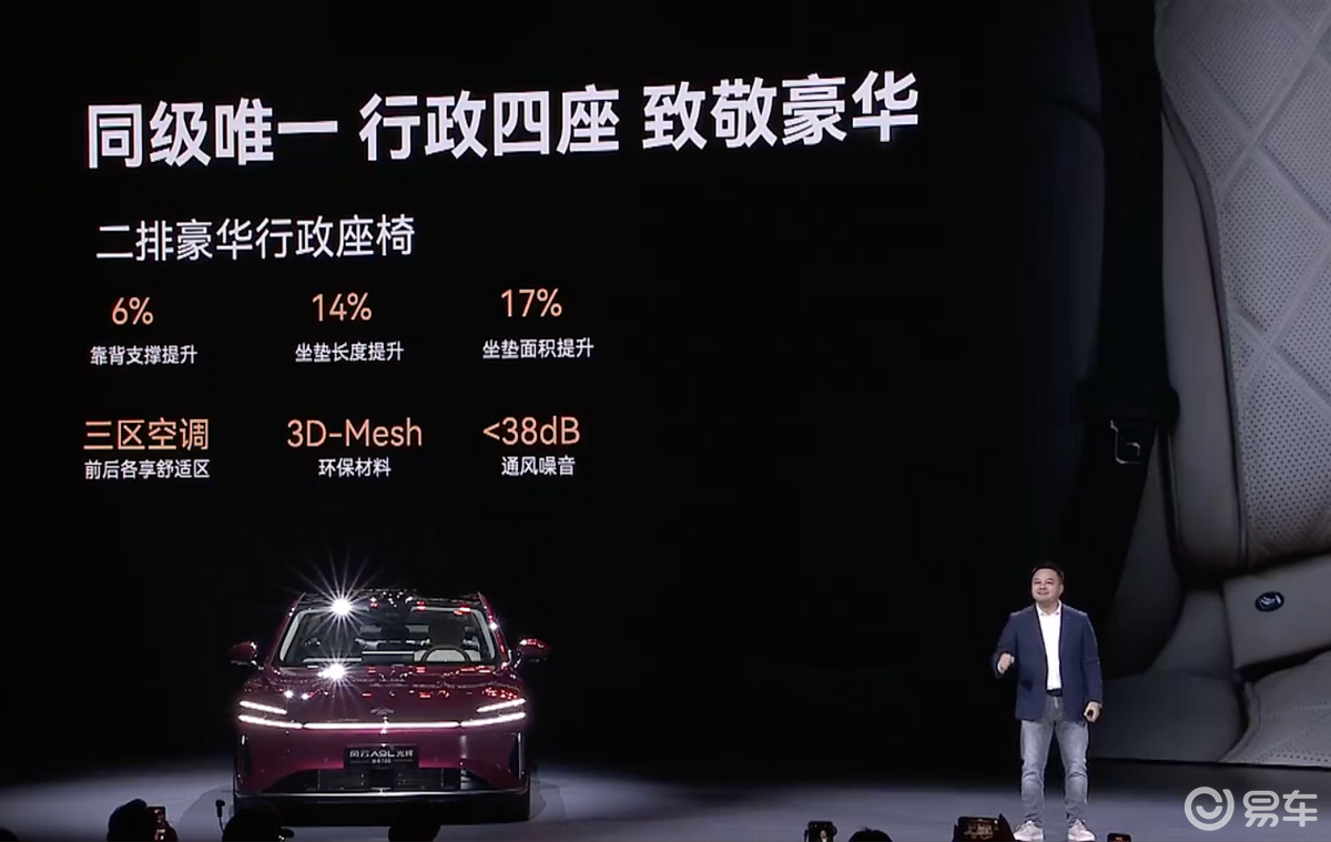 同级唯一行政四座,坐拥同级最大后排空间,1540mm最大横向空间、965mm后排头部空间、165mm后排膝部空间,还有1.2平方米侧窗视野同级最大。舒云座椅采用迈巴赫同款双绗缝工艺,以及13层舒适座椅结构,满配通风/加热/按摩/电调,还支持一键开启商务尊享模式。