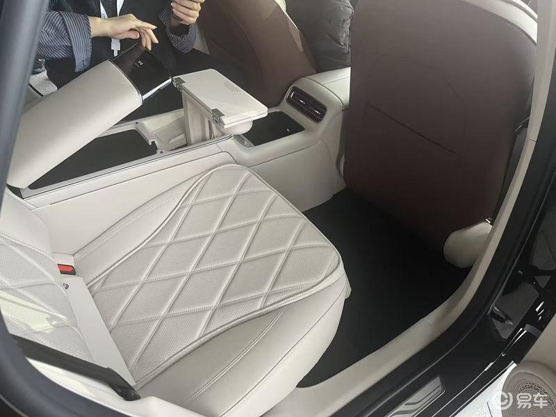 此外,四座版车型还推出了高雅的棕/米白双色配色,后排乘客享有座椅控制面板,支持通风/加热/按摩并配备隐藏车载桌板,中间原靠背位置是内嵌的冷暖箱,可做到-18-50摄氏度温度调节,进一步增加车辆的行政氛围与豪华感。