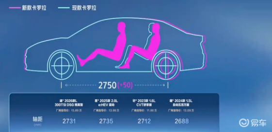 外观方面,新车采用丰田家族最新的造型设计,前脸环状全新灯组造型,下方为进气口造型与灯组融合。整体造型更加简洁时尚,有点新能源车设计语言的感觉。车辆尾部与现款车型差别不大,尾灯采用贯穿造型,并且采用熏黑设计,燃油版和智能电混双擎版保持一致。车身尺寸方面,长宽高分别为4710/1780/1435mm,轴距为2750mm,该轴距与丰田亚洲狮保持一致。