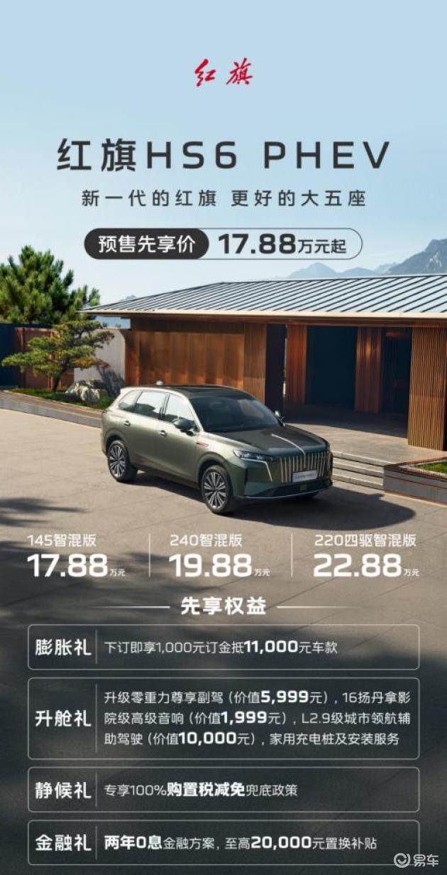 此次红旗HS6推出极具竞争力的预售方案,预售先享价17.88万元起,涵盖三大版本:145智混版17.88万元、240智混版19.88万元、220四驱智混版22.88万元。同时叠加多重诚意好礼,进一步降低家庭购车门槛: