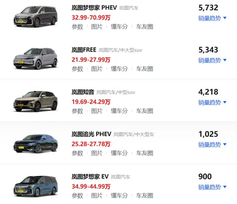 目前岚图梦想家PHEV和岚图FREE是岚图品牌中销量最好的车型,此外,岚图追光L也将于12月10日上市,该车搭载插电式混合动力,全系标配华为乾崑ads4+鸿蒙座舱5.1,同样值得期待。