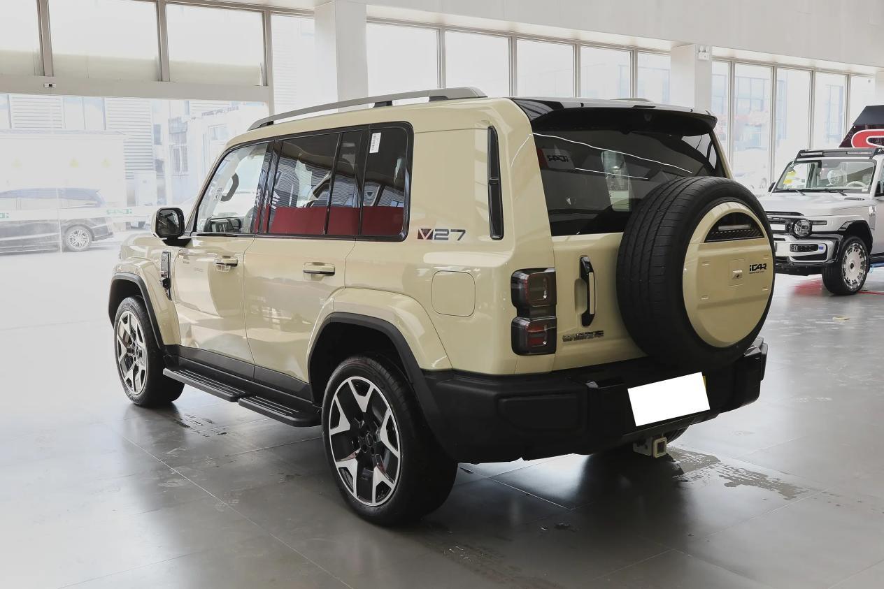 侧面来看,iCAR V27采用了横平竖直的线条勾勒,营造出了标志性的方盒子结构,车顶行李架、前后突出的轮眉、脚踏板、传统外置式门把手等设计,则进一步增添了它的硬派复古感。尺寸方面,据悉iCAR V27的长宽高分别为:5055/1976/1894mm,轴距为2910mm,属于中大型suv定位,个头大小和方程豹钛7差不多。