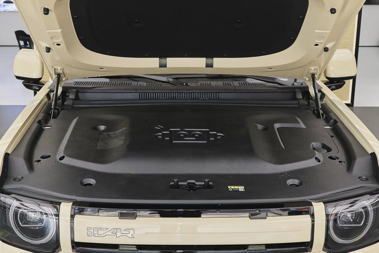 紧接着车位部分,iCAR V27也同样采用了很粗犷的硬派风设计,整体呈方正造型,两侧带有竖向尾灯组,后包围宽厚突出并且带有拖车钩。另外像是侧开尾门、外挂备胎这些也都有给到。值得一提的是,iCAR V27尾部除了外挂备胎以外,还提供有“小书包”的选项,能够进一步提升储物能力。