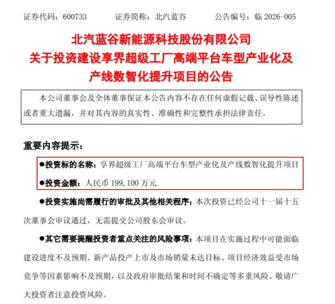 1月23日,北汽蓝谷新能源科技股份有限公司公告称,子公司北京新能源汽车股份有限公司拟投资19.91亿元建设享界超级工厂高端平台车型产业化及产线数智化提升项目。