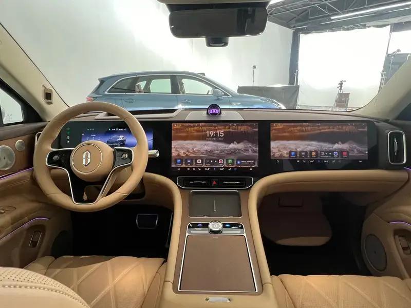 内饰部分,问界M9整体设计风格简约,全车采用高档NappA真皮,麂皮顶棚、同色系方向盘、水晶星环散射体及智慧旋钮以及天然白栓实木等,营造出了低调奢华的内饰氛围。