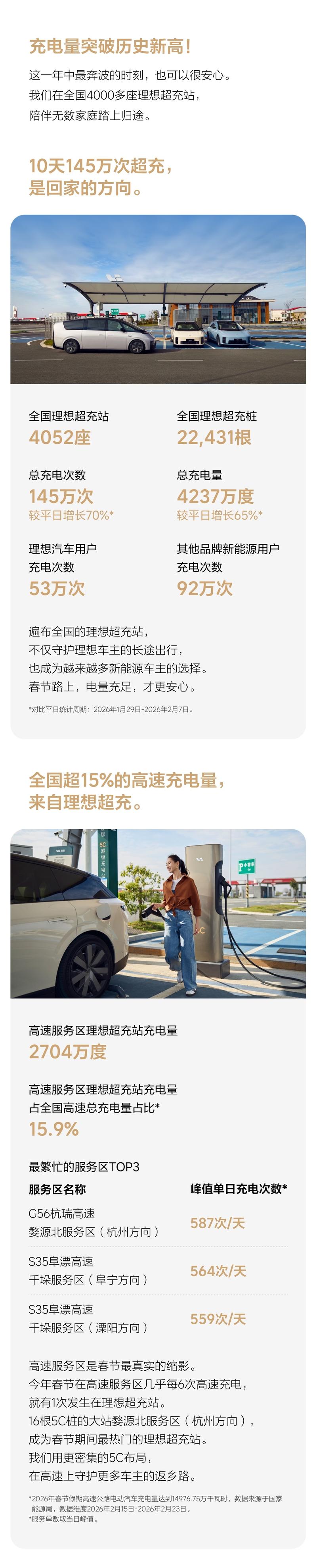 车讯 2月27日,理想汽车发布2026春节用户超充报告,2月14日-2月23日10天累计充电145万次,充电量再创新高,高速服务区的理想超充站充电量占全国高速总充电量15.9%。