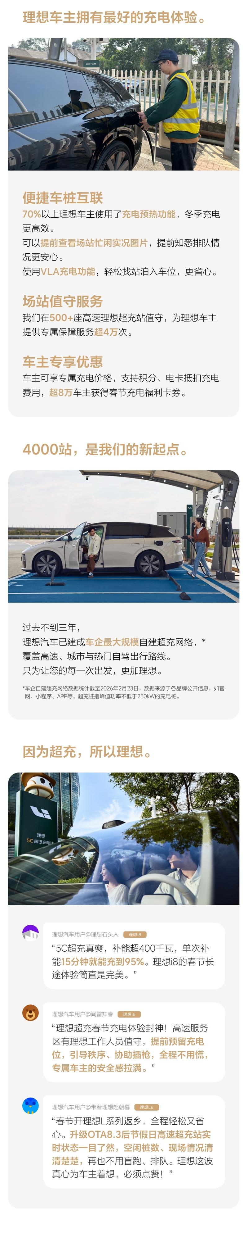目前,全国共有理想超充站4052座,理想超充桩22431根。2月14日-2月23日10天总充电次数145万次,较平日增长70%;总充电量4237万度,较平日增长65%,其中理想汽车用户充电次数53万次,其他品牌新能源用户充电次数92万次。