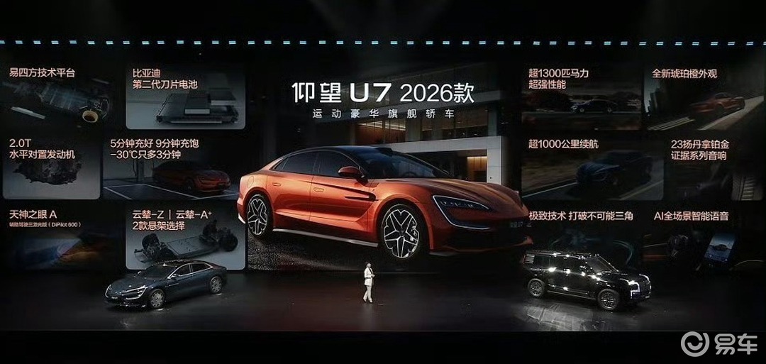 仰望U7 2026款售价65.8万元起,首搭全新升级的第二代刀片电池,EV版电池容量增至150.01kWh,CLTC纯电续航提升至1006km,PHEV版综合续航达1100km。在闪充技术加持下,可实现“5分钟充好、9分钟充饱、零下30度只多3分钟”的极致快充体验,让每一次出行都更加高效从容。