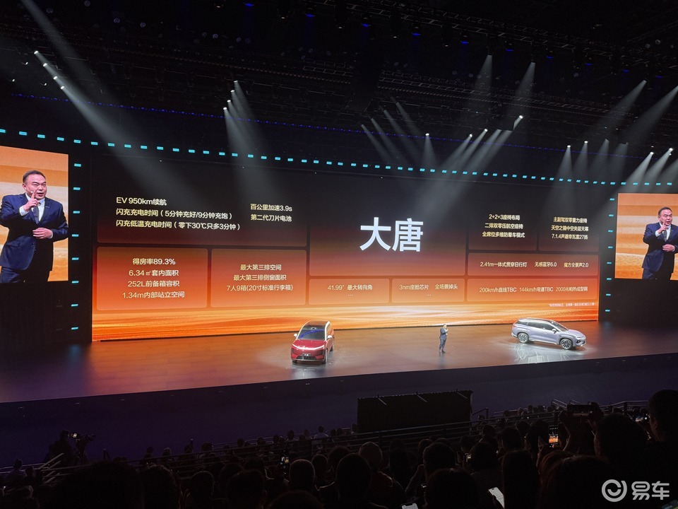 大唐作为王朝网全新旗舰suv,以“大格局、东方气韵”为设计理念。新车搭载第二代刀片电池,纯电续航高达950公里,并支持闪充技术,补能效率接近燃油车。提供宽敞的七座空间。二排配备带一体式腿托的独立航空座椅,三排座椅支持电动角度调节和加热功能,全车采用高级菱格缝线工艺。智能化配置上,大唐搭载天神之眼B高阶辅助驾驶系统,支持城区和高速NOA。云辇-A智能底盘与双腔空气悬架的搭配,兼顾舒适性与操控性。作为比亚迪冲击高端SUV市场的力作,大唐将东方美学与顶尖电动技术深度融合,满足家庭用户对豪华、空间、续航的全方位需求。