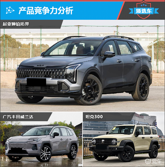 起亚新狮铂拓界定位为紧凑型SUV,在满足日常家用需求的同时,还充分兼顾了个性表达,十分适合追求高性价比、注重驾乘质感的年轻消费群体。综合考虑品牌影响力、车型定位以及售价区间,最终我为其挑选的竞品车型分别是广汽丰田威兰达和坦克300。