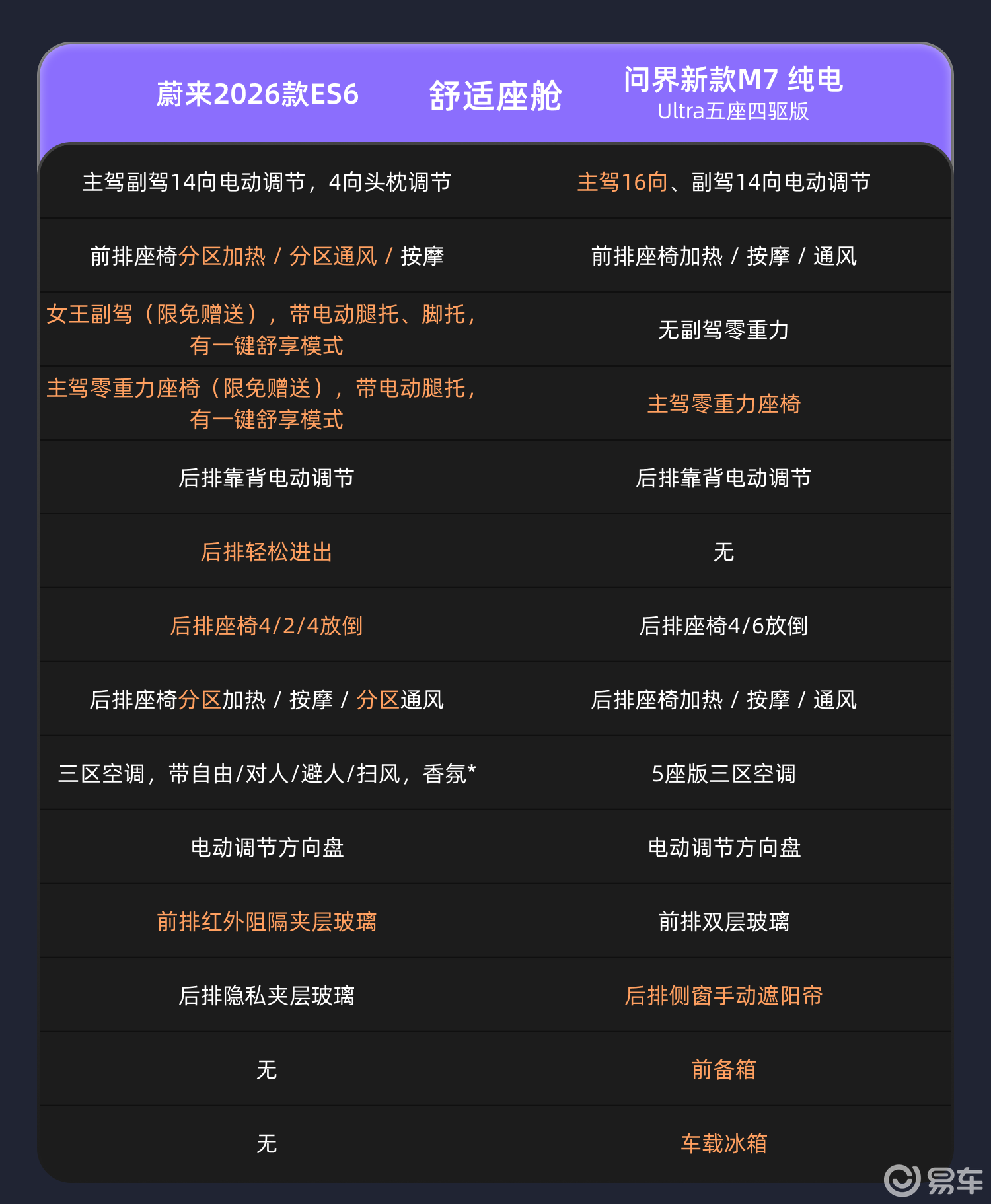 舒适座舱体验:蔚来 2026 款 ES6 前后排均衡,问界 M7 纯电版主驾独优结论:蔚来 2026 款 ES6 的前后排舒适体验更均衡,适配全场景家庭出行,问界 M7 纯电版仅主驾配置突出,后排体验存在短板。