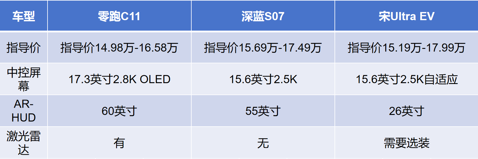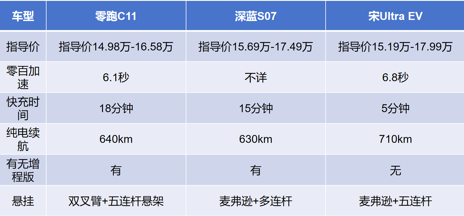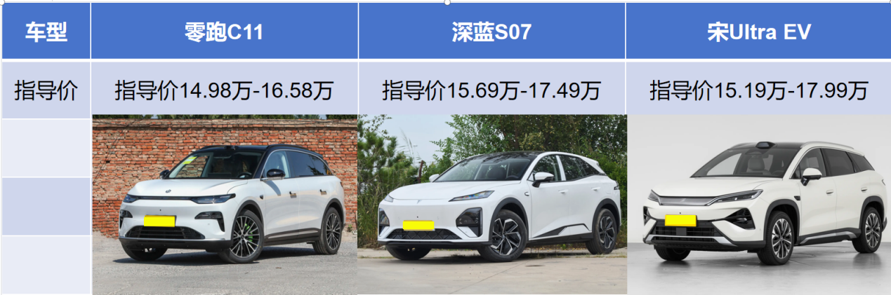 先来看看价格端,2026款零跑C11提供5个型号,指导价14.98万-16.58万,包含纯电以及增程式版本可选。深蓝S07提供7个型号,指导价15.69万-17.49万,也是走的纯电和增程式的路子。而宋ultra EV提供4个型号,指导价15.19万-17.99万,全系均为纯电动力。就价格端来看,零跑C11是这三款车型里面价格比较低的,而且提供两套动力形式。